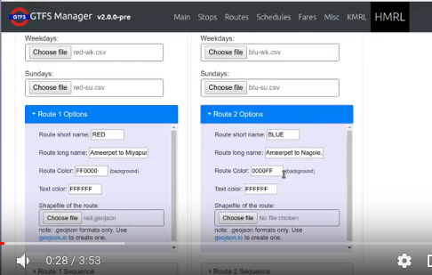 This page handles the specific CSV format↗ of HMRL, Hyderabad, India. There are some files to upload and some settings to set before converting to GTFS. Please make your way through each of the tabs.